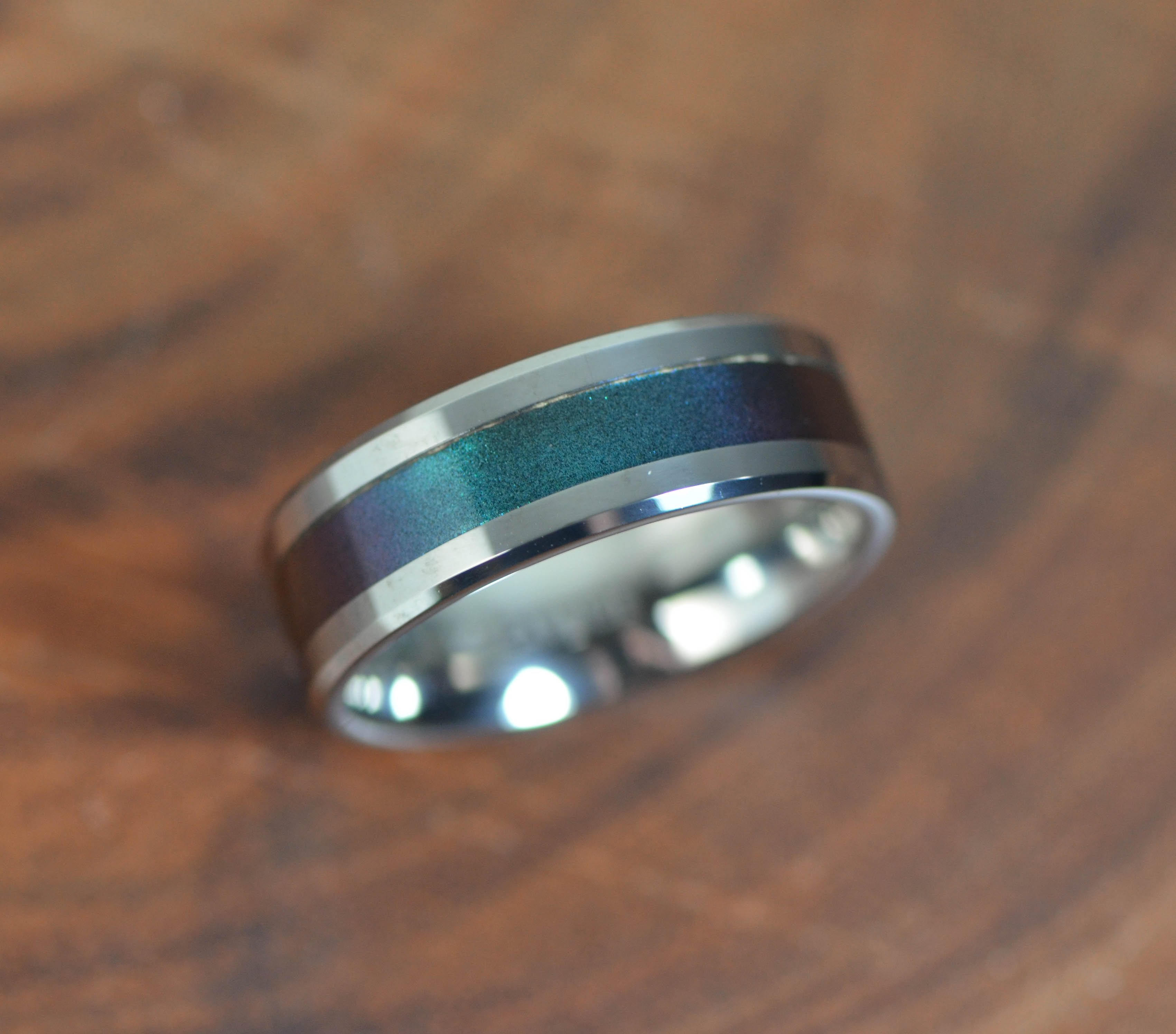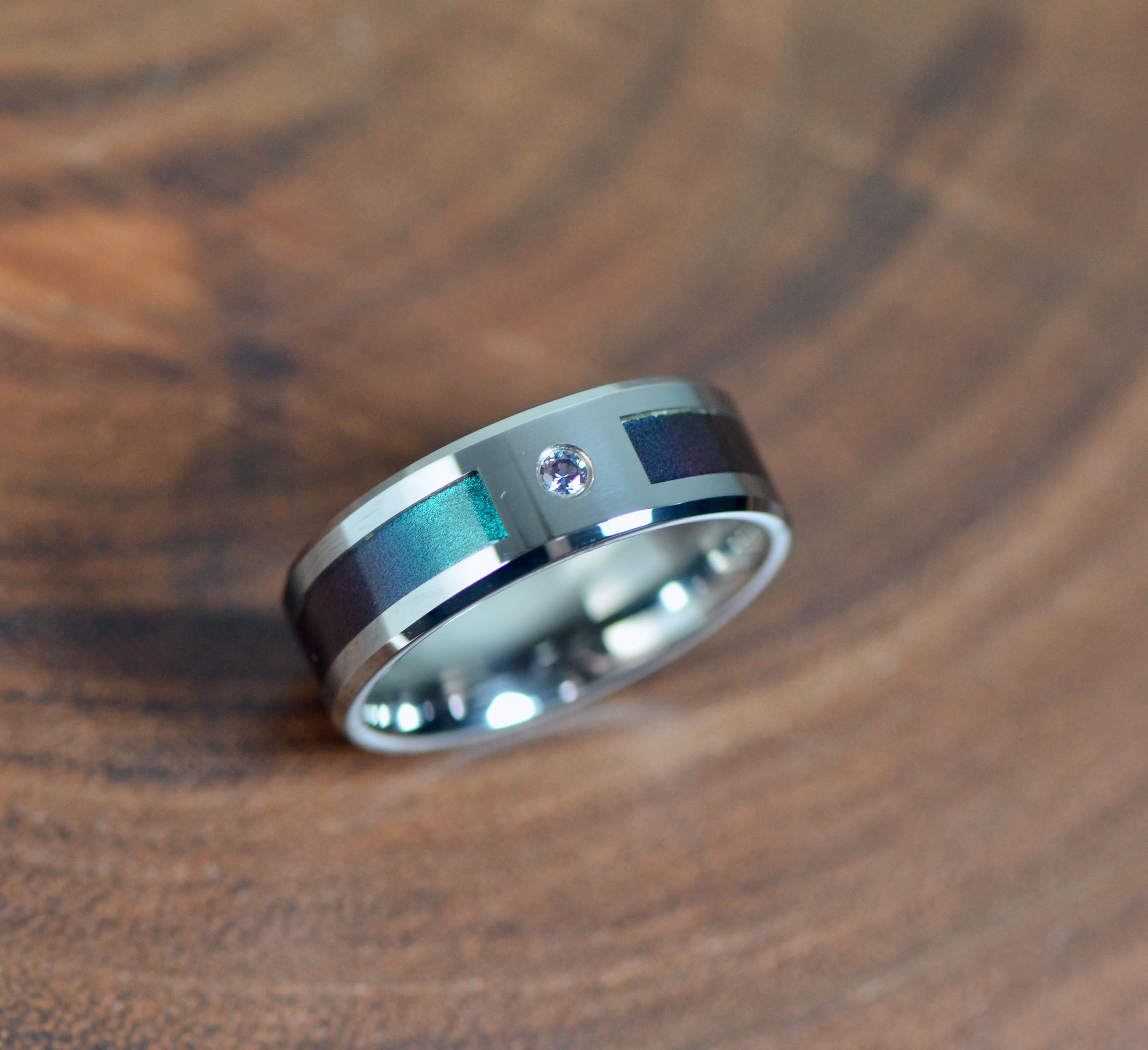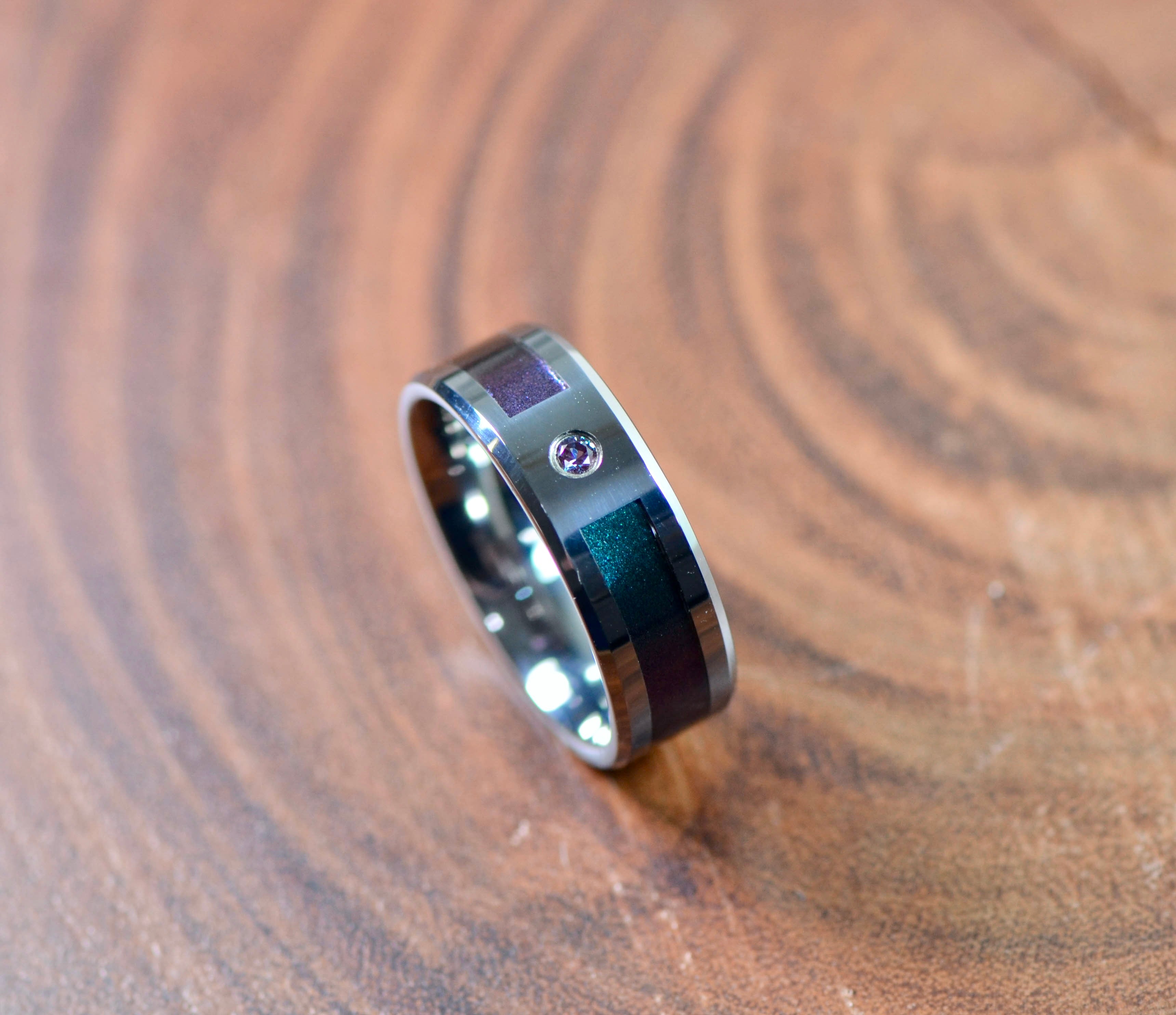 Stunning and unique this is a one of a kind color changing design. This ring features sleek beveled tungsten edges with a gorgeous blue and purple color changing inlay. All of this is coupled with a matching color changing Alexandrite stone inlaid into the ring.