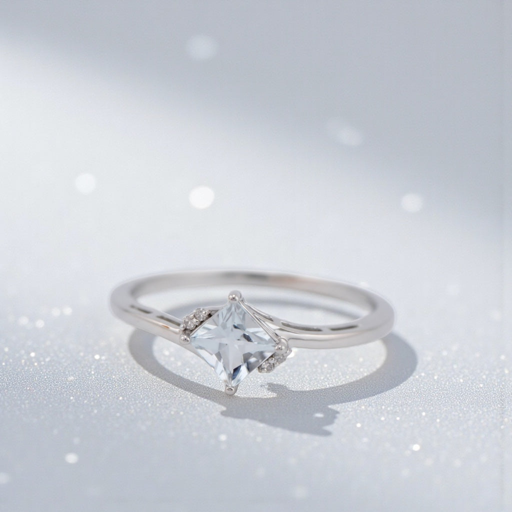Sterling Silver Princess Square Genuine Gemstone & Diamond Rings - Aquamarine or Peridot