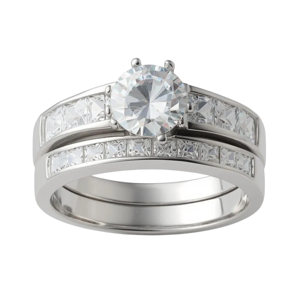 Sterling Silver 2-Piece CZ Round Center with Square Channel Wedding Ring Set