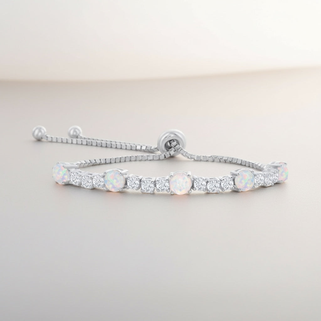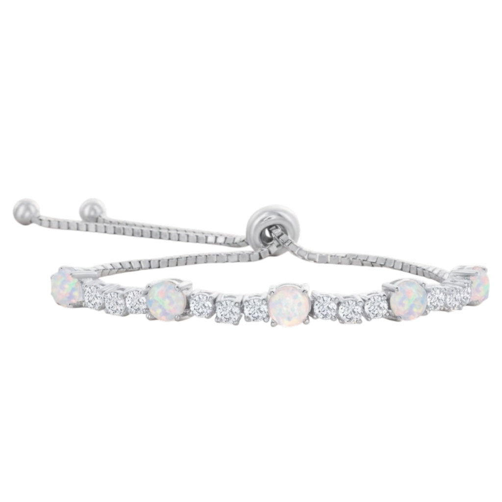Sterling Silver White Created Opal And CZ Adjustable Bolo Bracelet