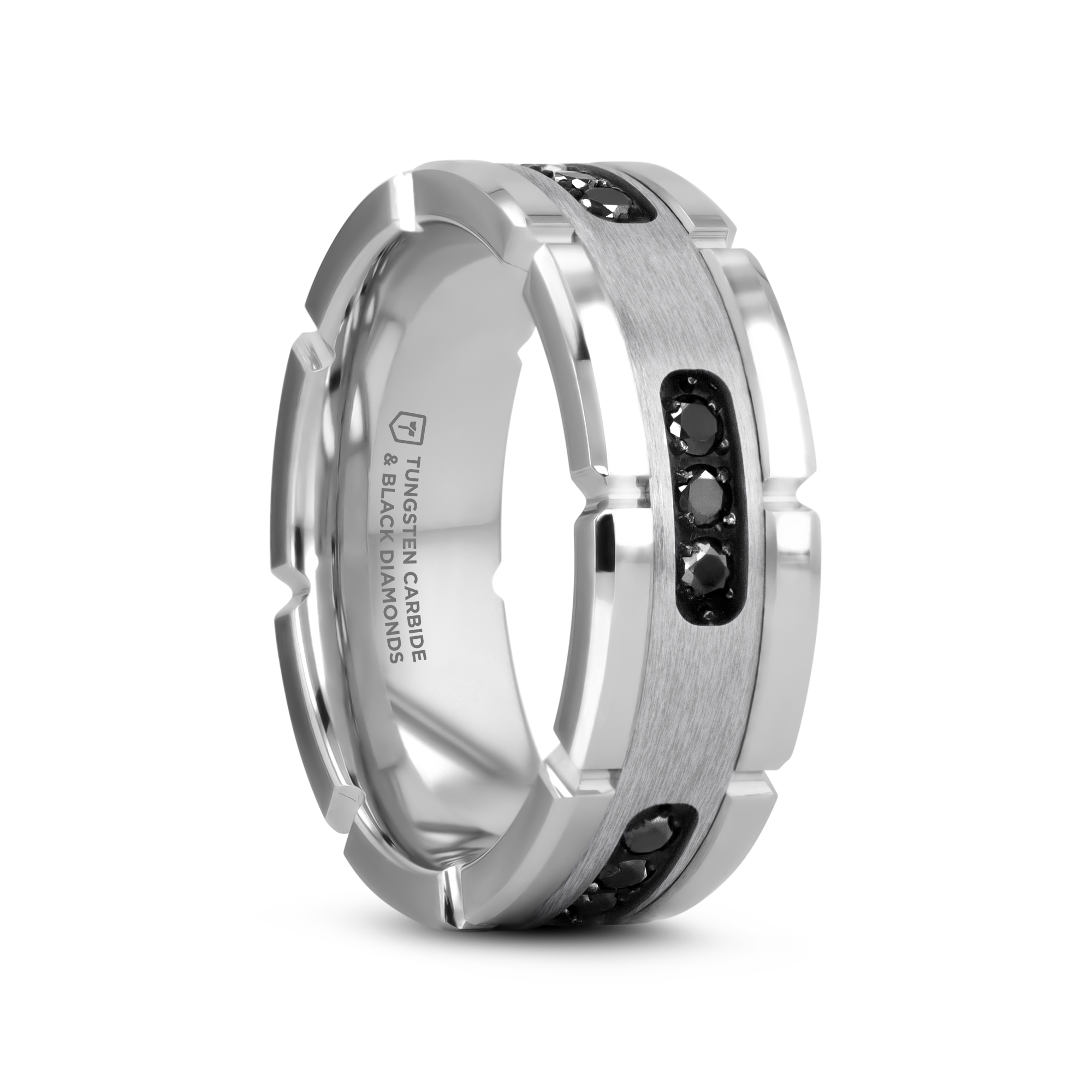 This bold Tungsten Carbide ring has a grooved band with polished notches a marvelous silver inlay with inset stunning round-cut, black diamonds.