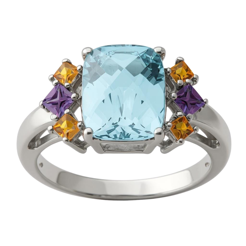 Sterling Silver Ant. Cushion Light Swiss Blue Topaz, Amethyst & Citrine Ring
