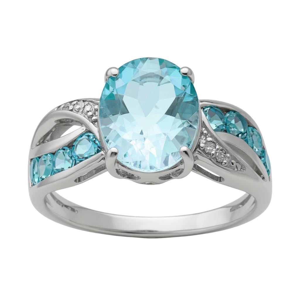 Anillo ovalado de plata de ley con diamantes y topacio azul suizo claro
