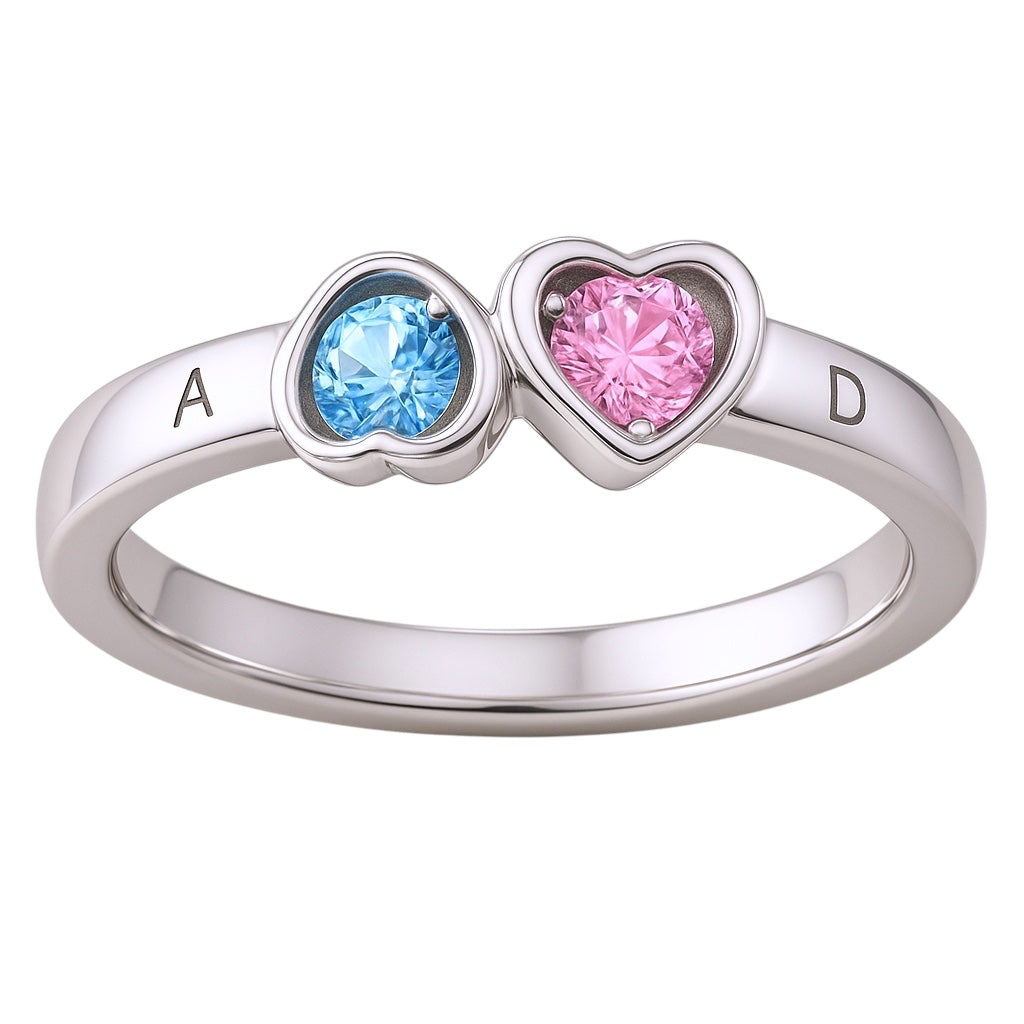 Anillo de 2 piedras con piedra natal y corazón para madre o pareja