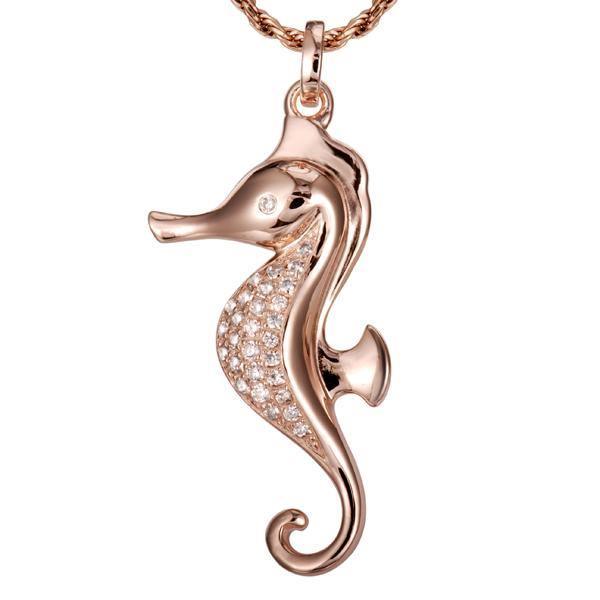 Este colgante de oro rosa macizo de 14 quilates presenta nuestro motivo original de caballito de mar pavimentado con diamantes.