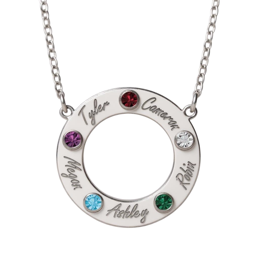 Collier pendentif rond ouvert avec noms et pierres de naissance pour la famille de la mère