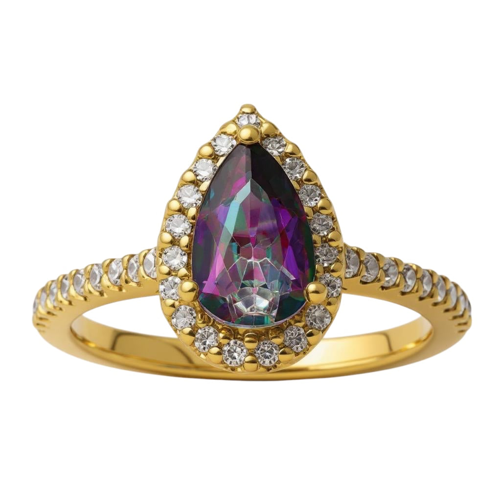 Bague de fiançailles en or jaune 14 carats avec topaze de feu mystique poire et halo de diamants