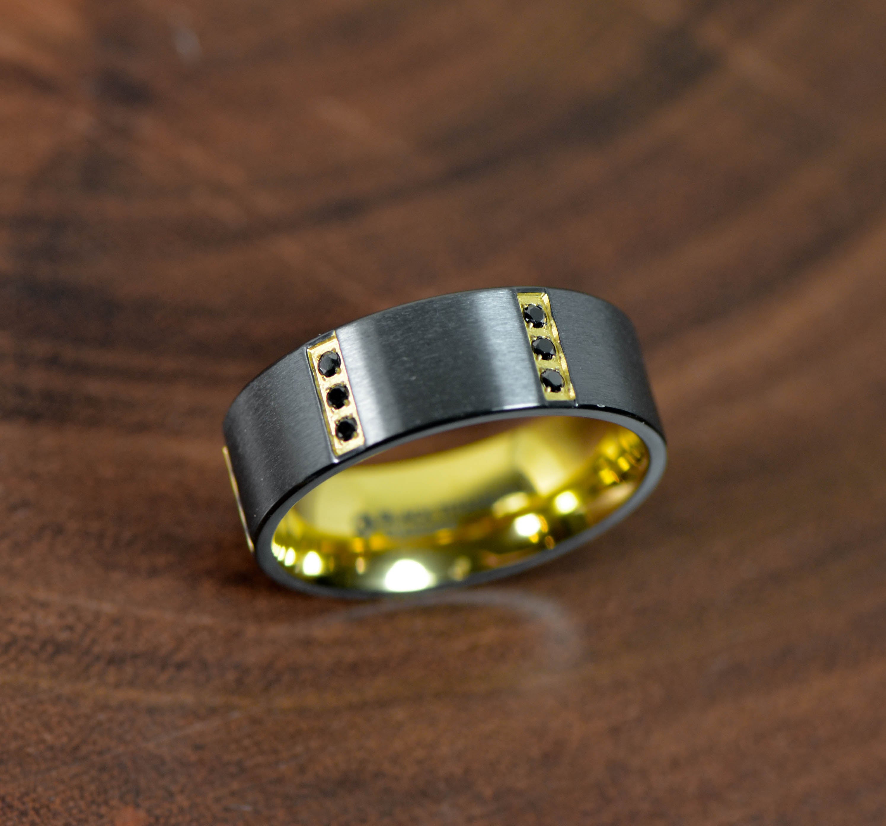 Bague Thorsten MURAMASA en titane noir brossé plat, intérieur plaqué or, sertie de 6 diamants noirs et sertie de trois diamants noirs.