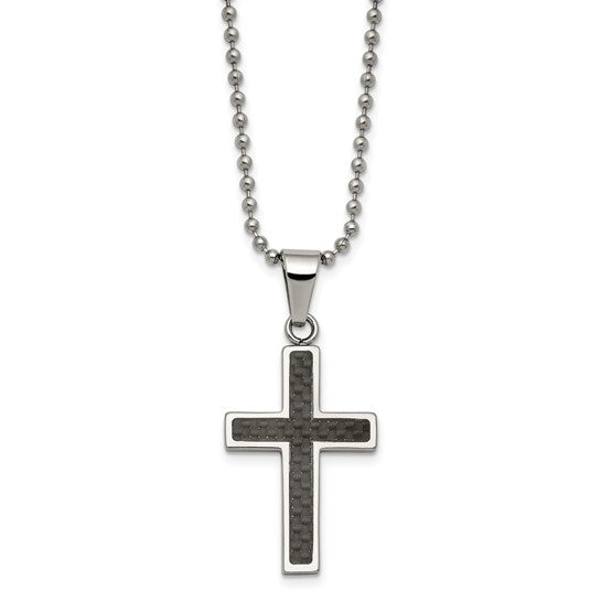 Collier en acier inoxydable poli avec incrustation de fibre de carbone, croix de 22 pouces