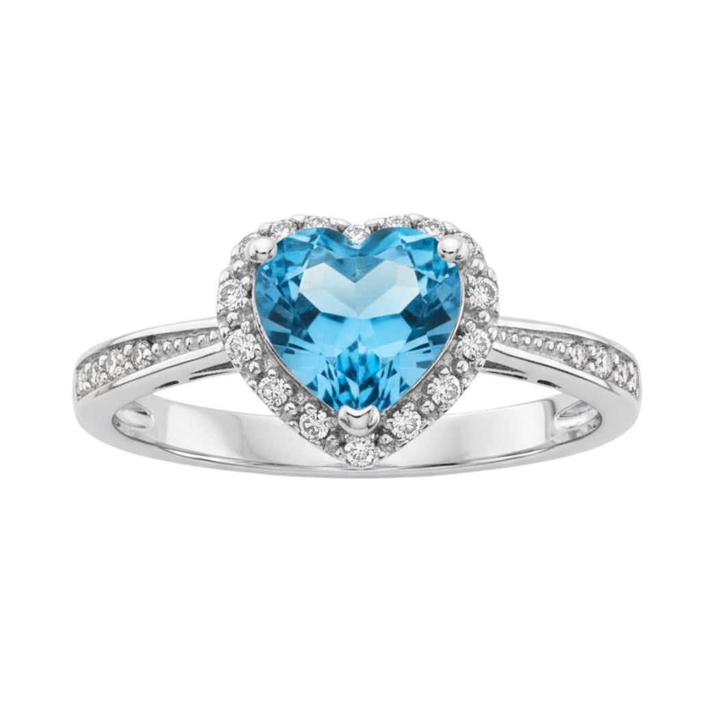 Bague en argent sterling, topaze bleue et diamant en forme de cœur