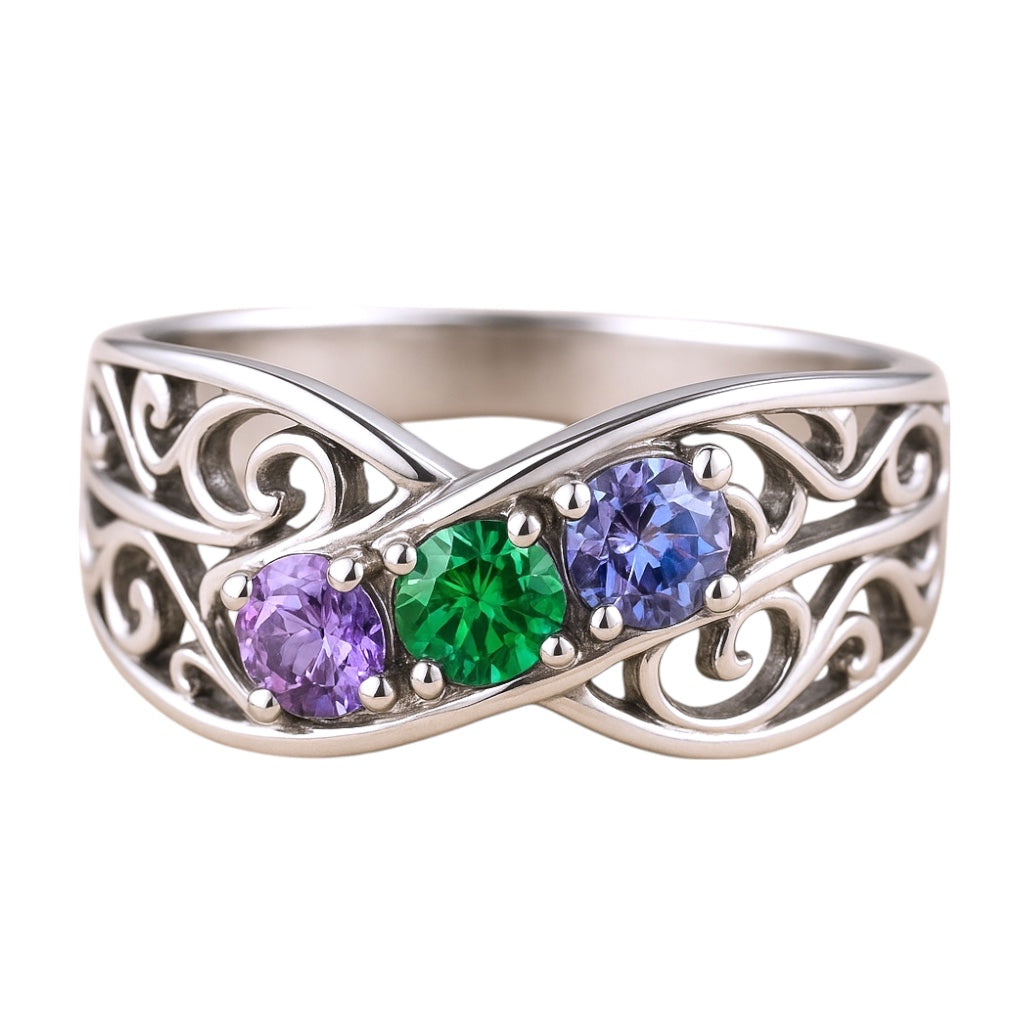 Cette bague avec pierre de naissance de la famille de la mère en pierre de 4 mm doublée de filigrane est un cadeau parfait pour toute mère ou grand-mère. Cette bague familiale de premier ordre présente un design ajouré en filigrane magnifiquement complexe et comporte jusqu'à cinq pierres précieuses rondes de 4 mm - un moyen idéal pour afficher fièrement chacune des pierres de naissance de vos enfants. Fabriquée en argent sterling ou en or massif, c'est une pièce spéciale qu'elle chérira pendant des années.