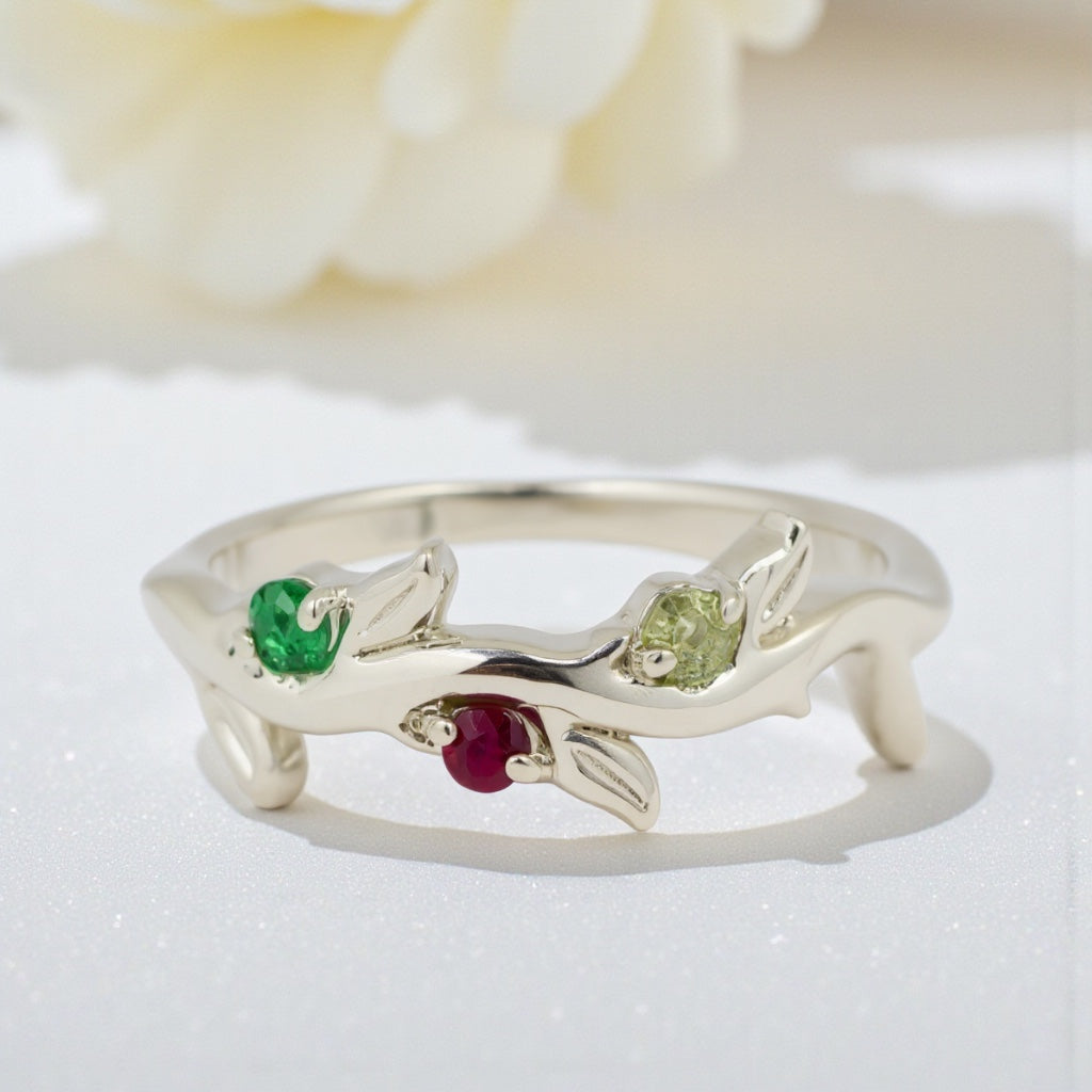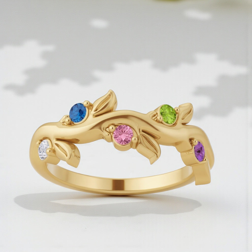 Bague branche florale avec pierre de naissance de la famille de la mère