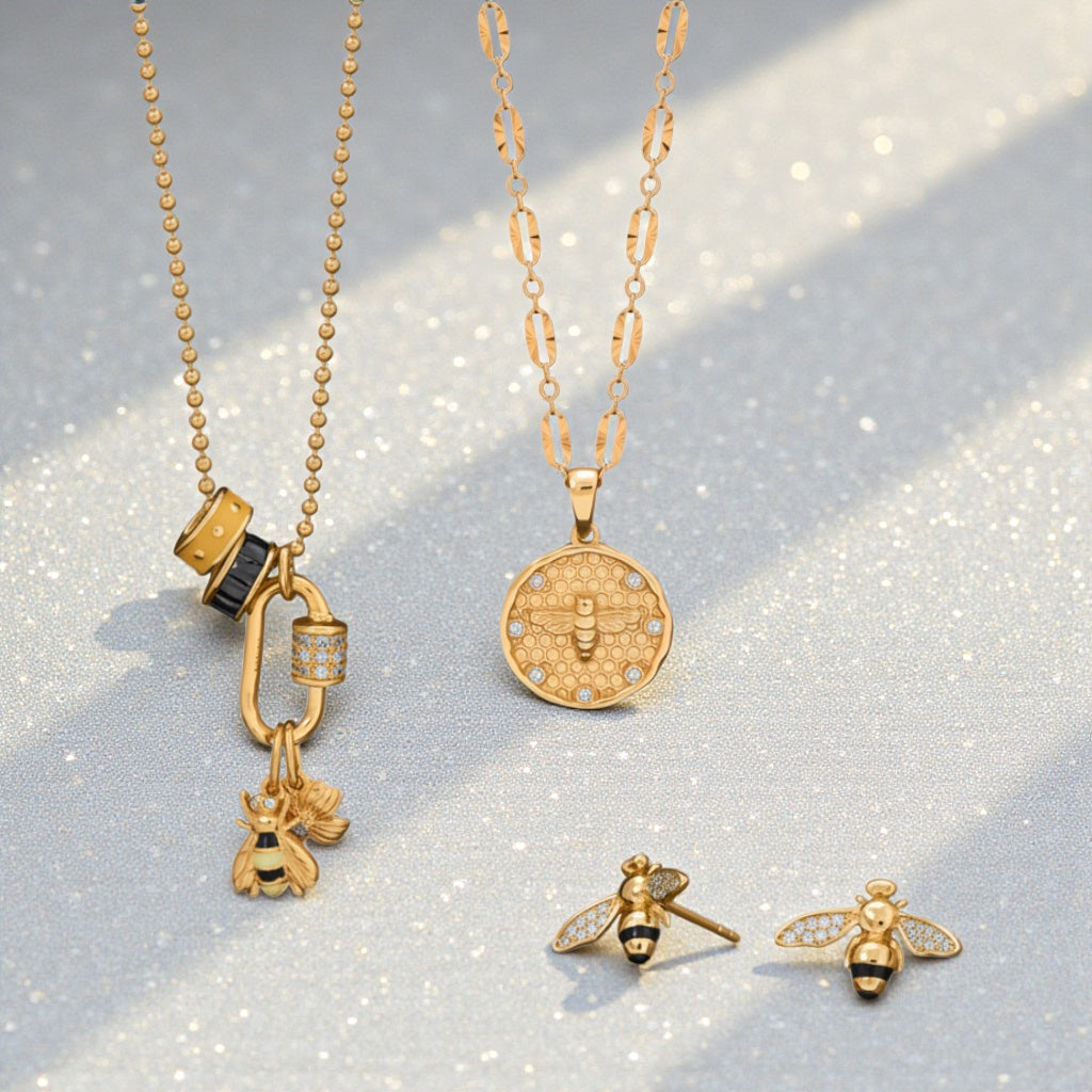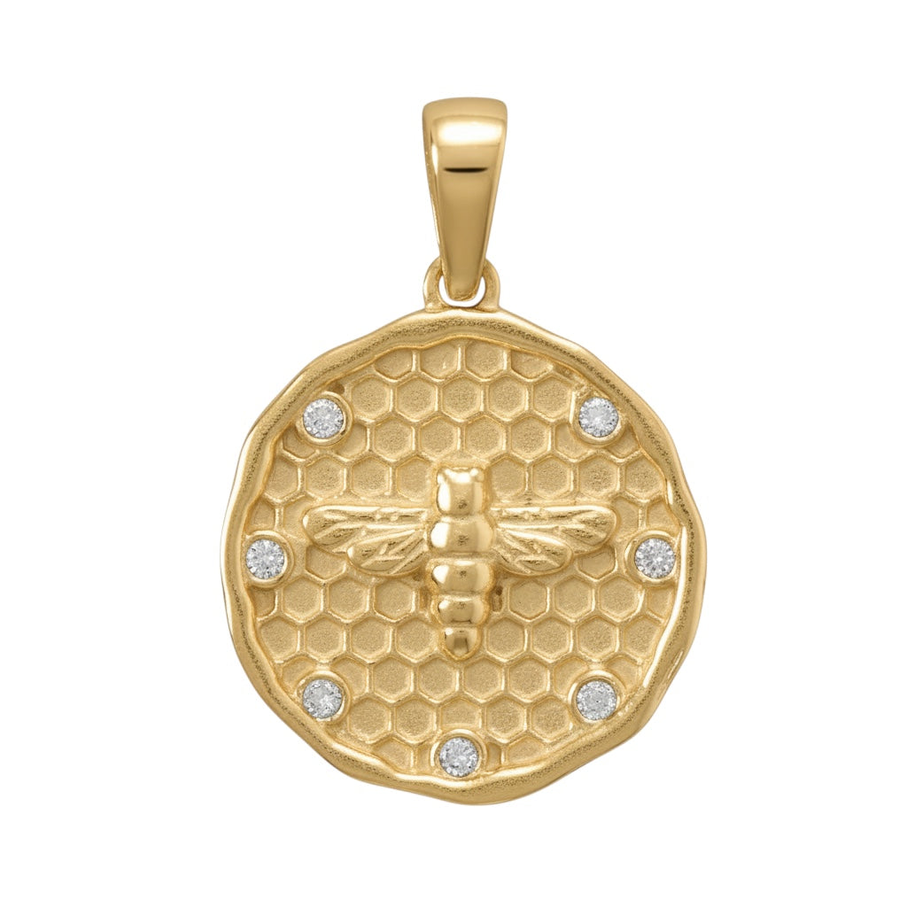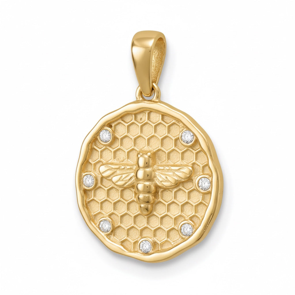 14k Gold Plated Honeycomb, Bee and CZ Pendant