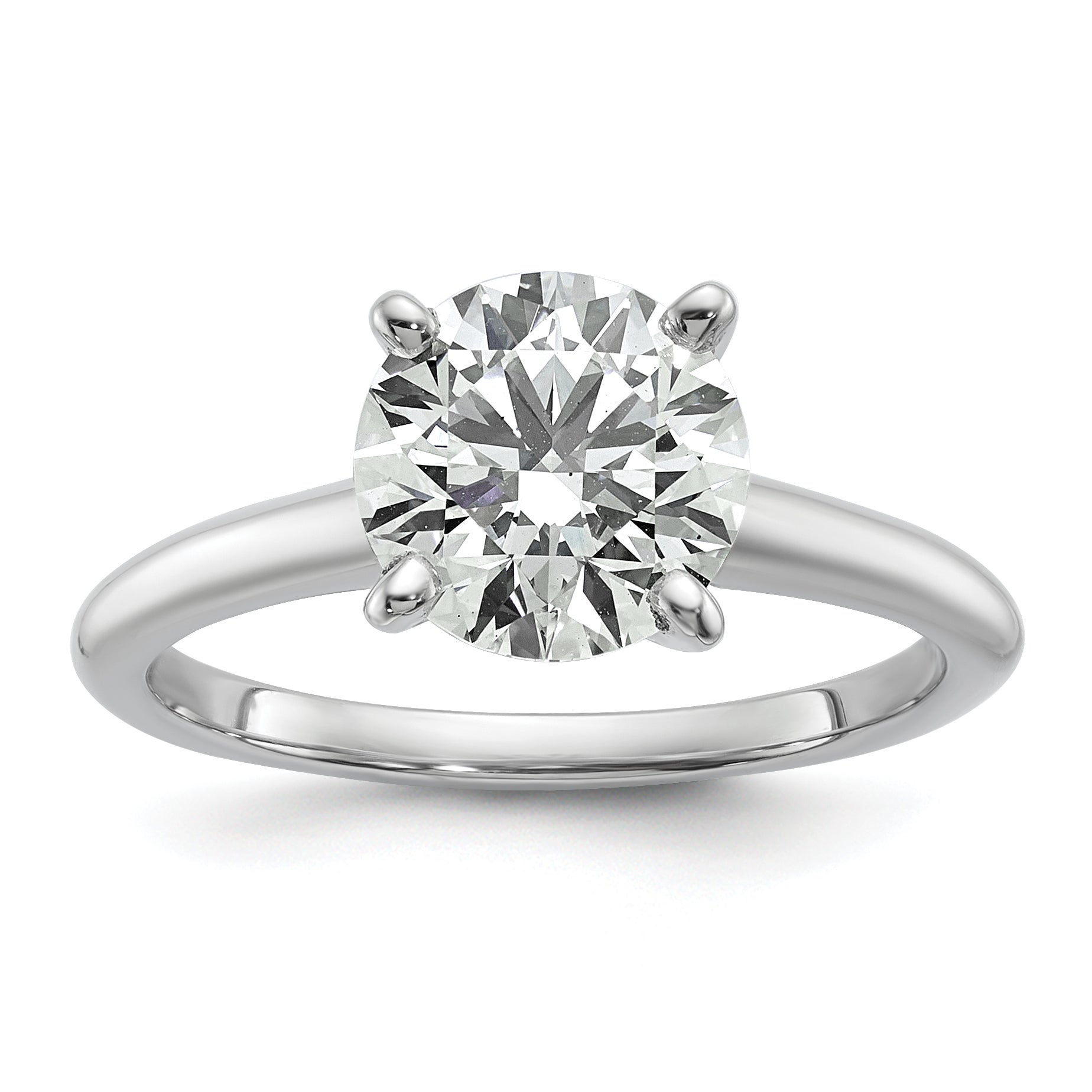 Presenting the 14k White Gold 2 Ct. Lab Grown Diamond VS/SI+ G+ Round Solitaire Engagement Ring, an exceptional choice for your engagement. Crafted from polished 14k white gold with rhodium plating, it features a brilliant 2-carat lab-grown diamond exhibiting VS/SI clarity. The pristine white gem is expertly cut and secured in a classic four-prong setting, combining sophistication with a timeless silhouette.