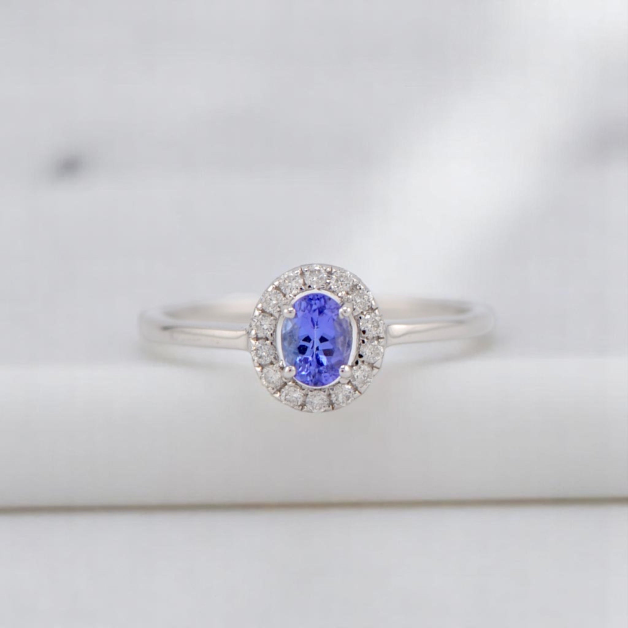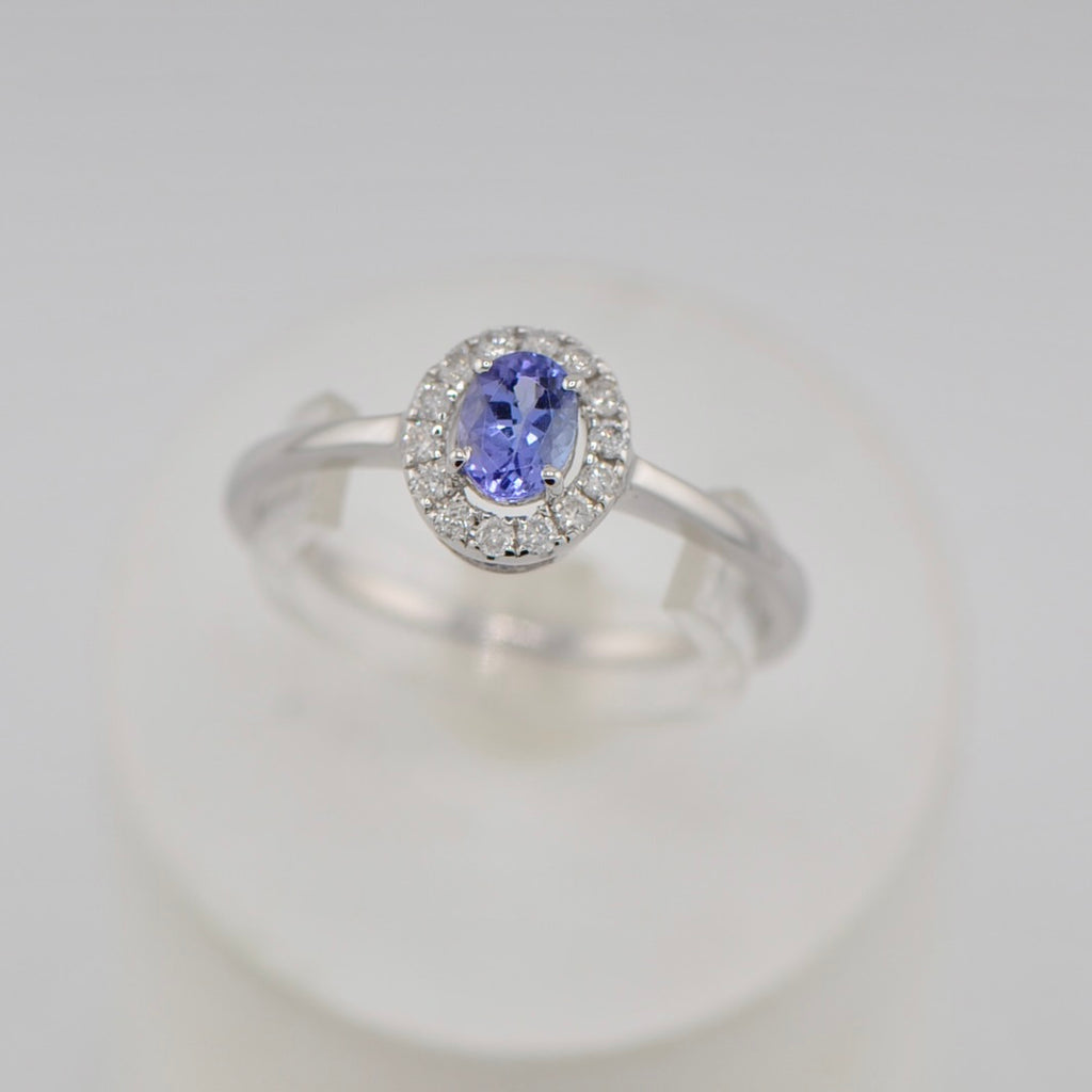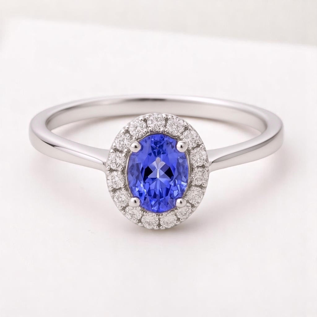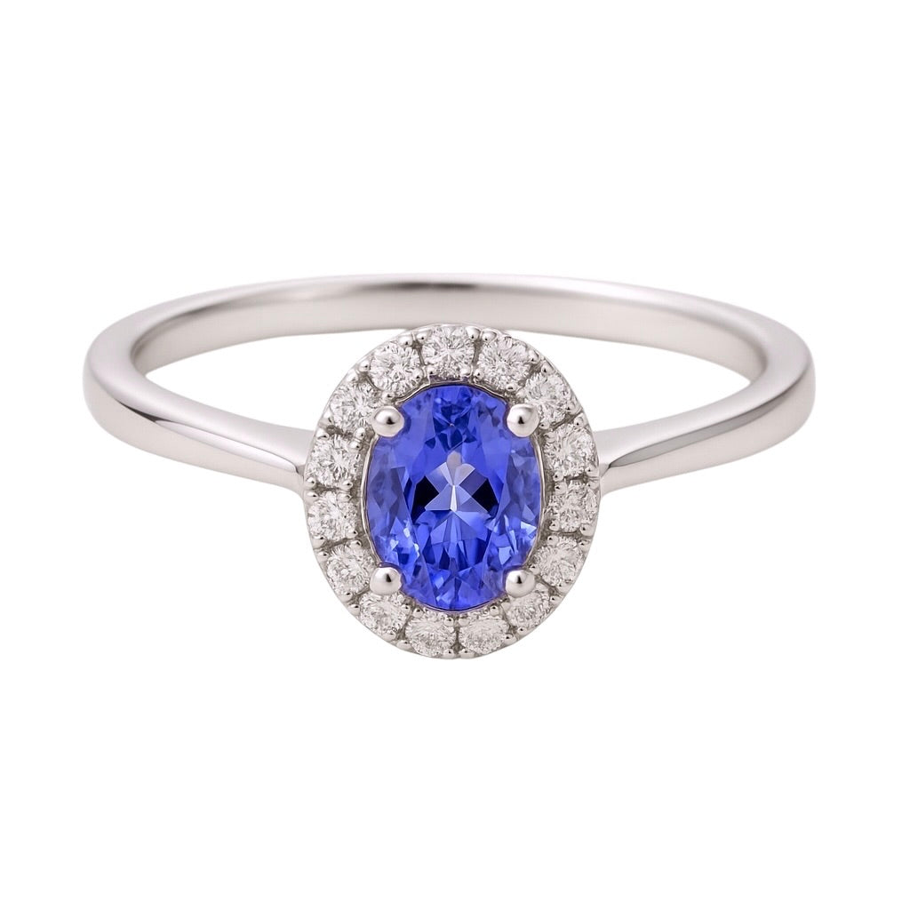 18k White Gold 6x4 Oval Genuine Tanzanite and Diamond Halo Ring