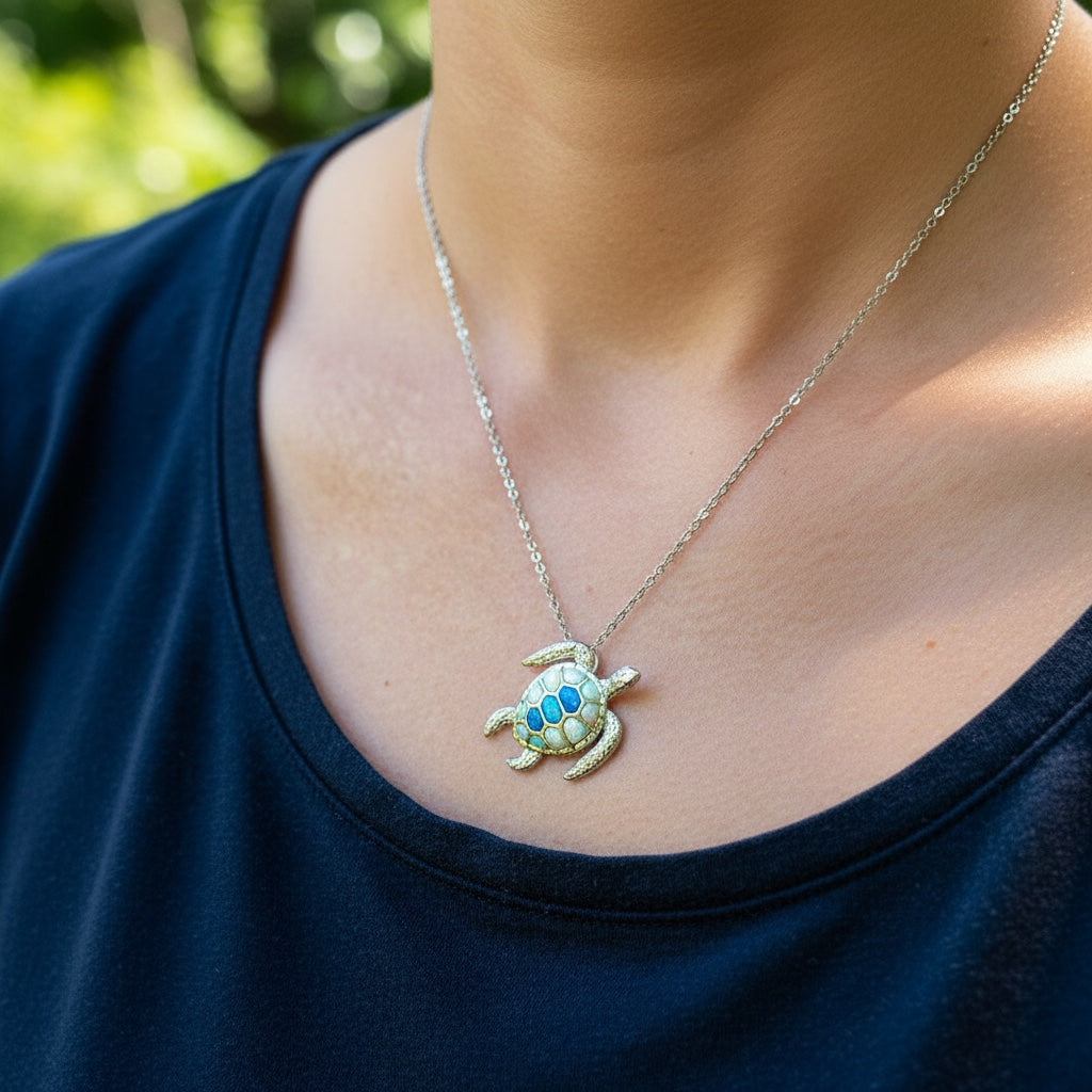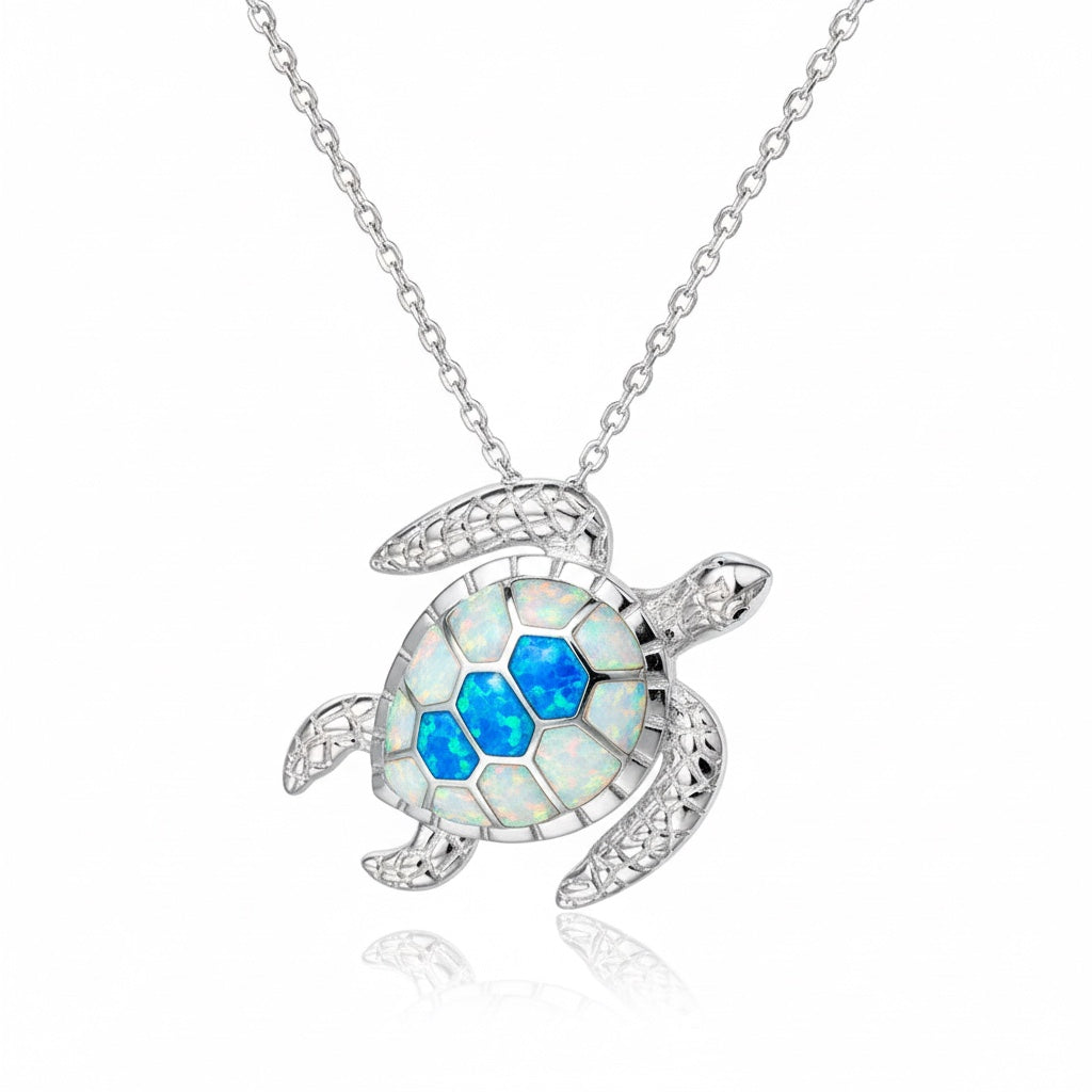 Crafted from 925 sterling silver, this sea turtle pendant showcases our signature honu design complemented by a striking multicolor sustainable opal displaying white and ocean blue hues. A sophisticated piece that merges traditional symbolism with contemporary gemstone artistry.