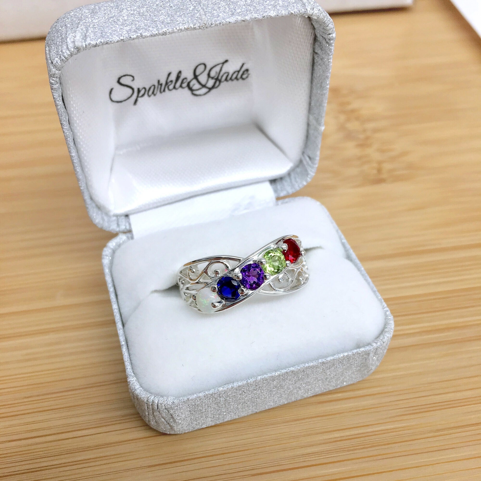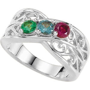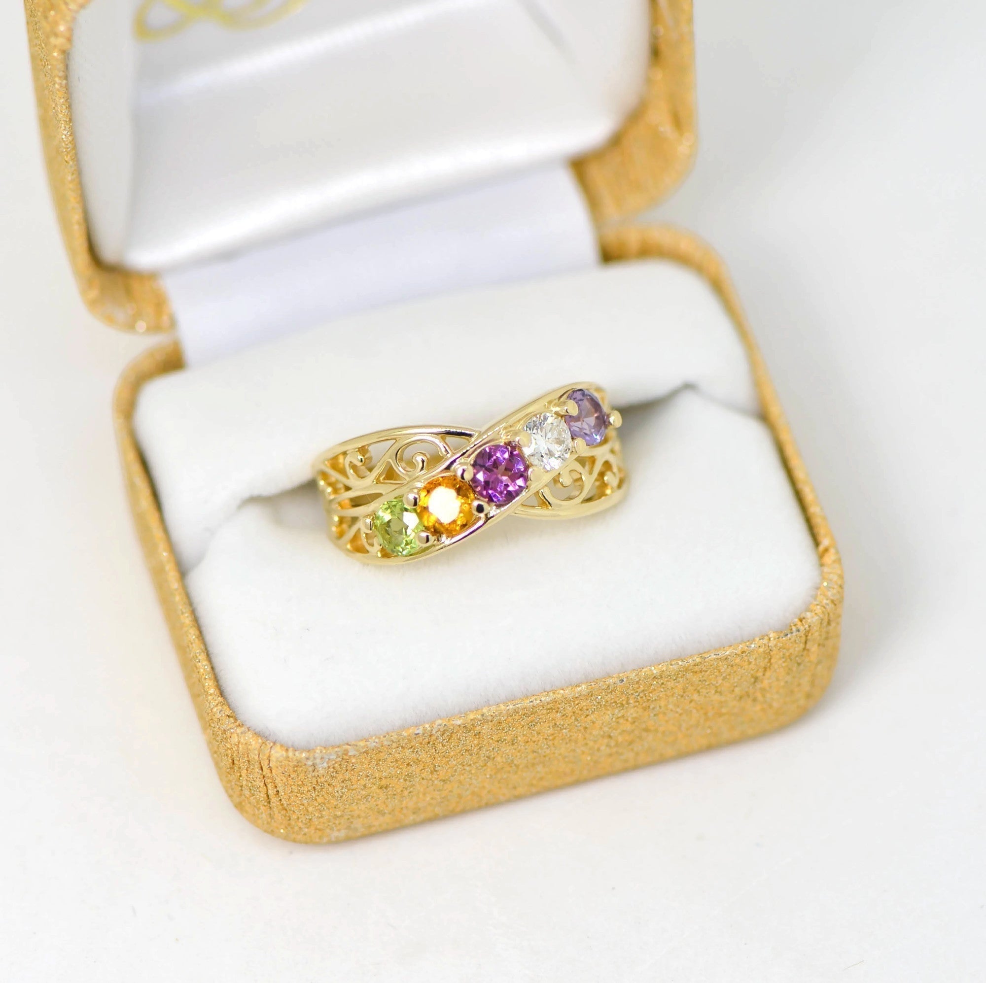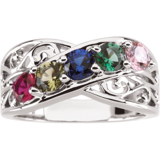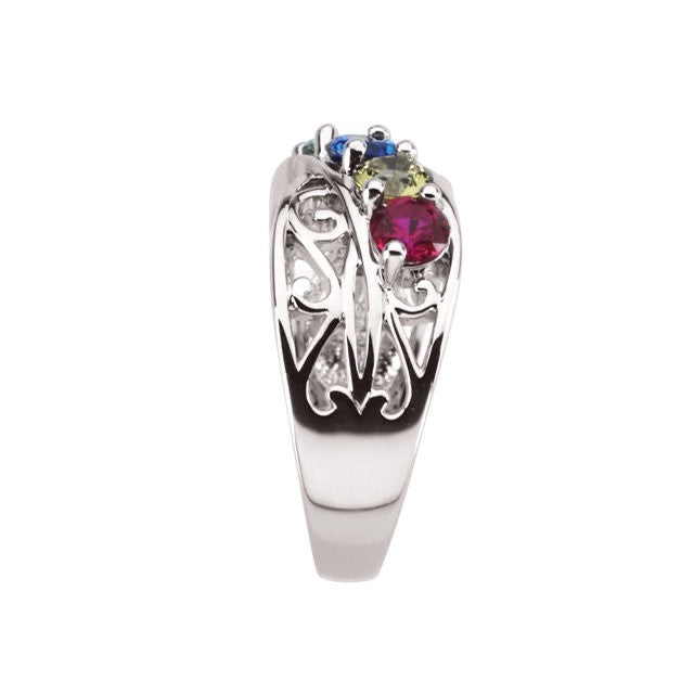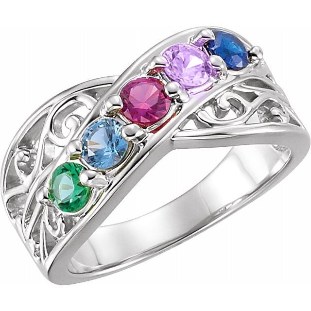 This Filigree Lined 4mm Stone Mother's Family Birthstone Ring makes a perfect gift for any mother or grandmother. This top-rated mother's family ring has a beautifully intricate filigree openwork design and boasts up to five 4mm round gemstones - a perfect way to proudly display each of your children's birthstones. Crafted in either sterling silver or solid gold, it's a special piece that she'll cherish for years to come.