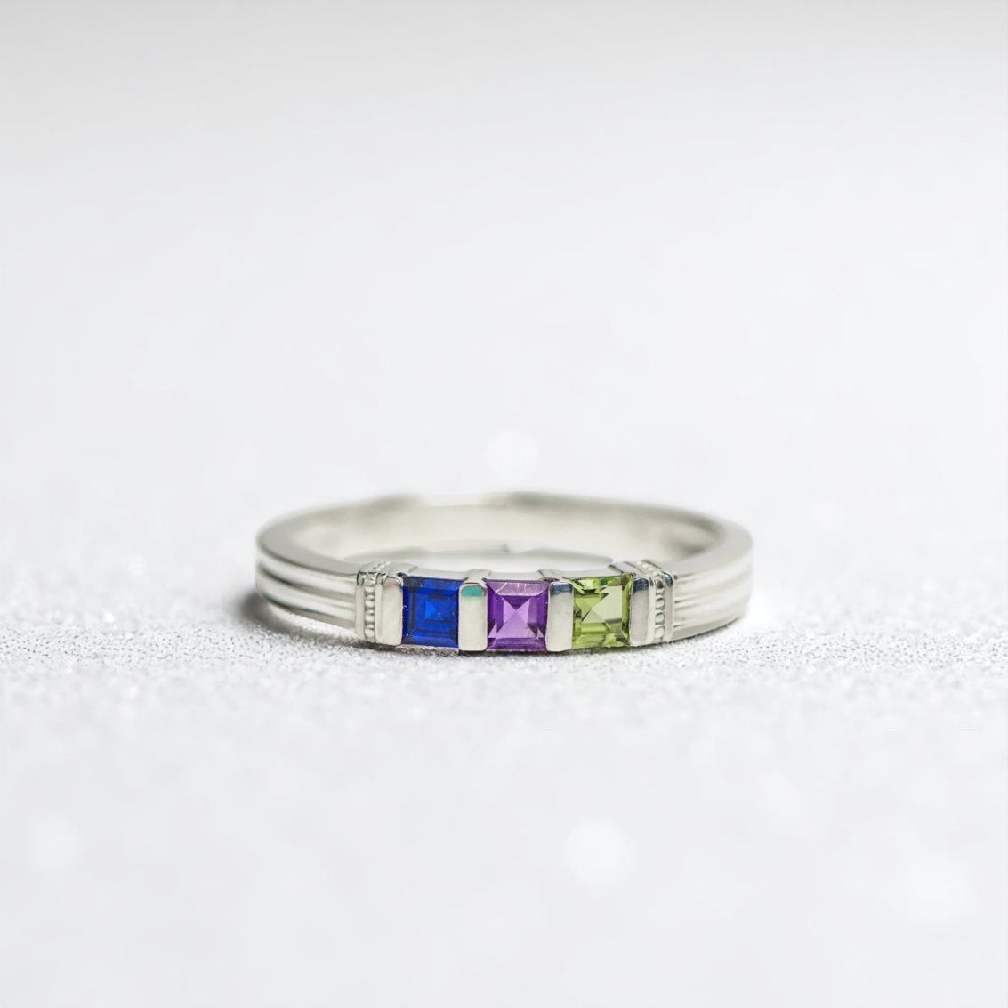 This beautiful Princess Square Channel Set Family Birthstone Ring is set with up to three stones, perfect for your family. Crafted from high-quality sterling silver or solid gold, this classic design is timeless and perfect for any occasion.