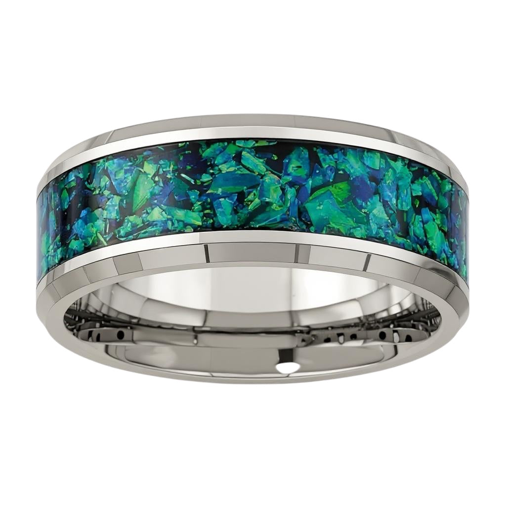 Stainless Steel Polished Finish Blue Opal Inlay 8mm Men's Ring