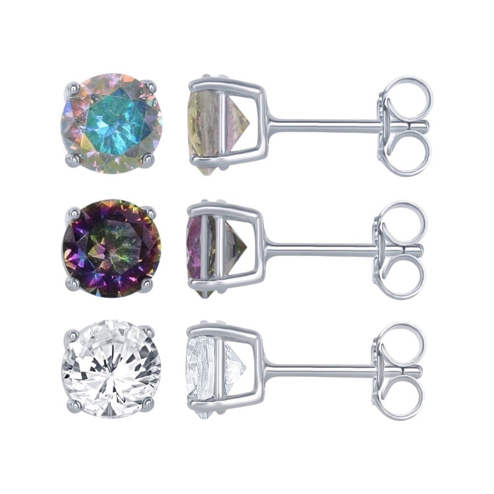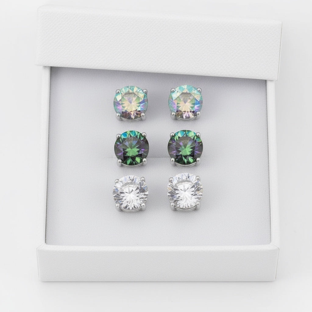 Sterling Silver 6mm Round Set of 3 Round Clear, AB and Mystic Rainbow Stud Earrings