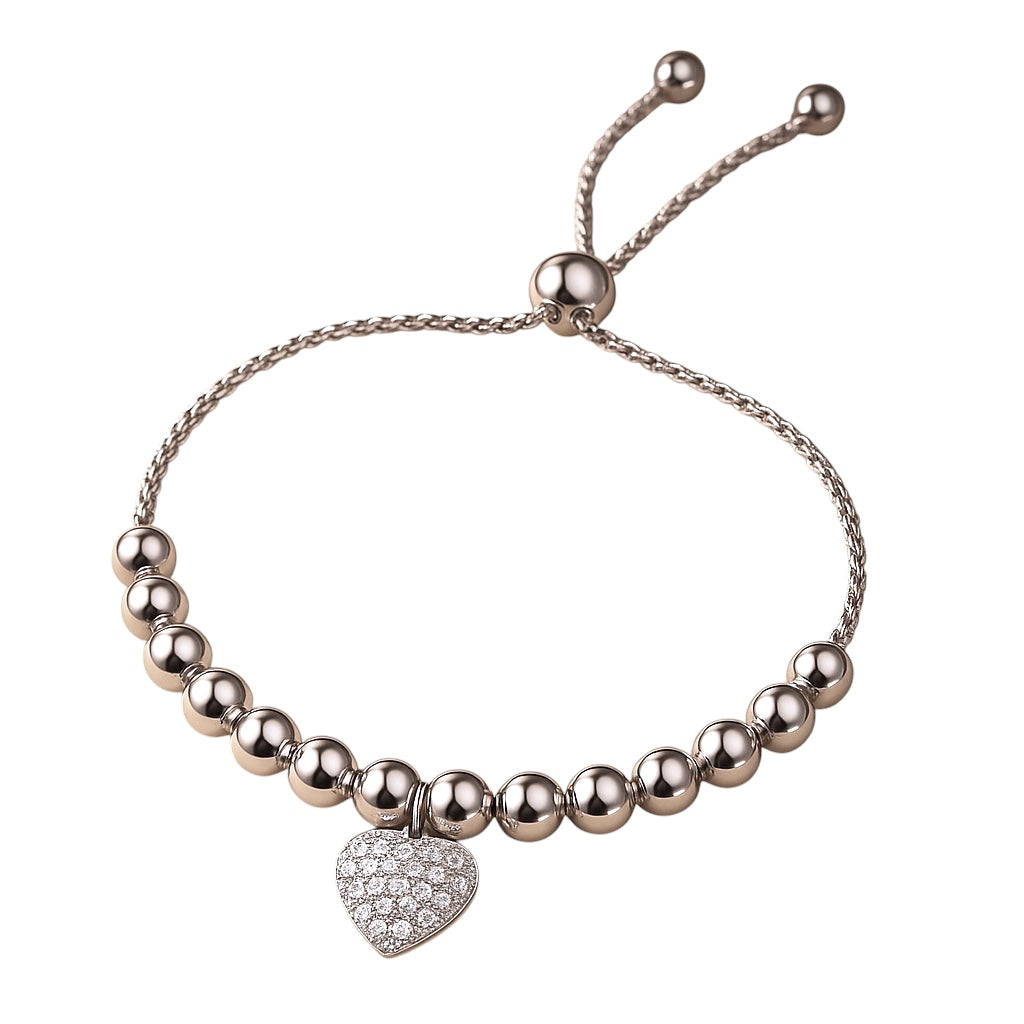 Sterling Silver Heart Bead CZ Charm Adjusable Bolo Bracelet