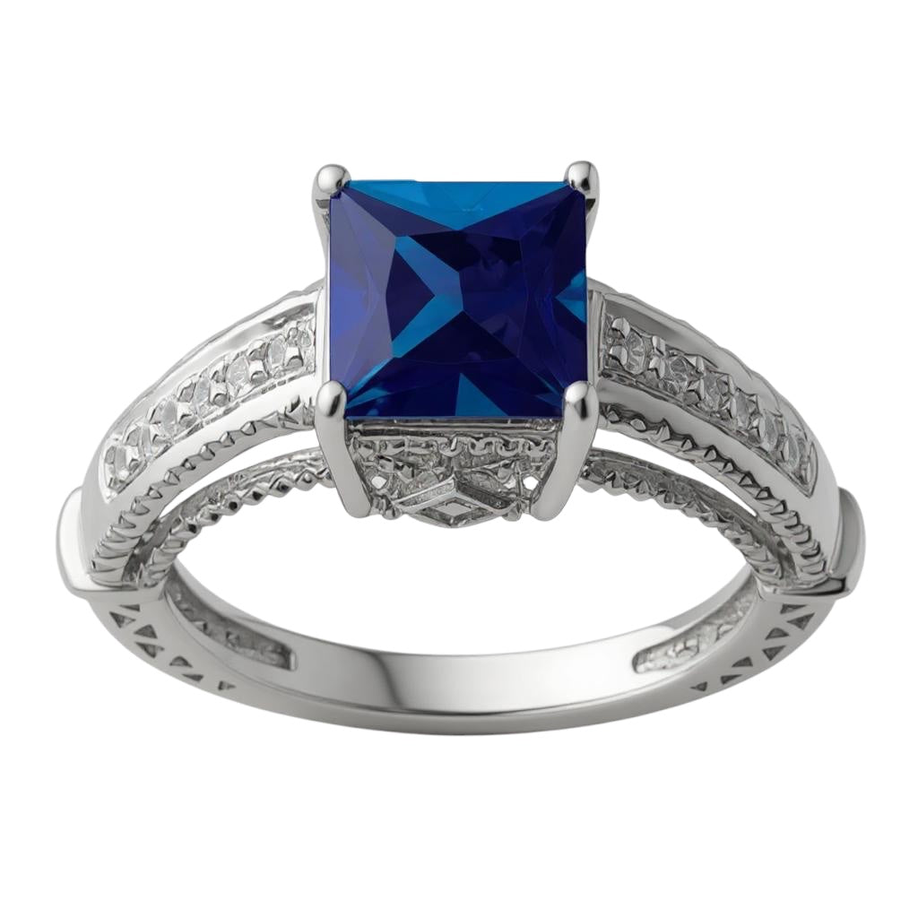 Sterling Silver Lab-Created Blue Sapphire Square Princess & CZ Ring