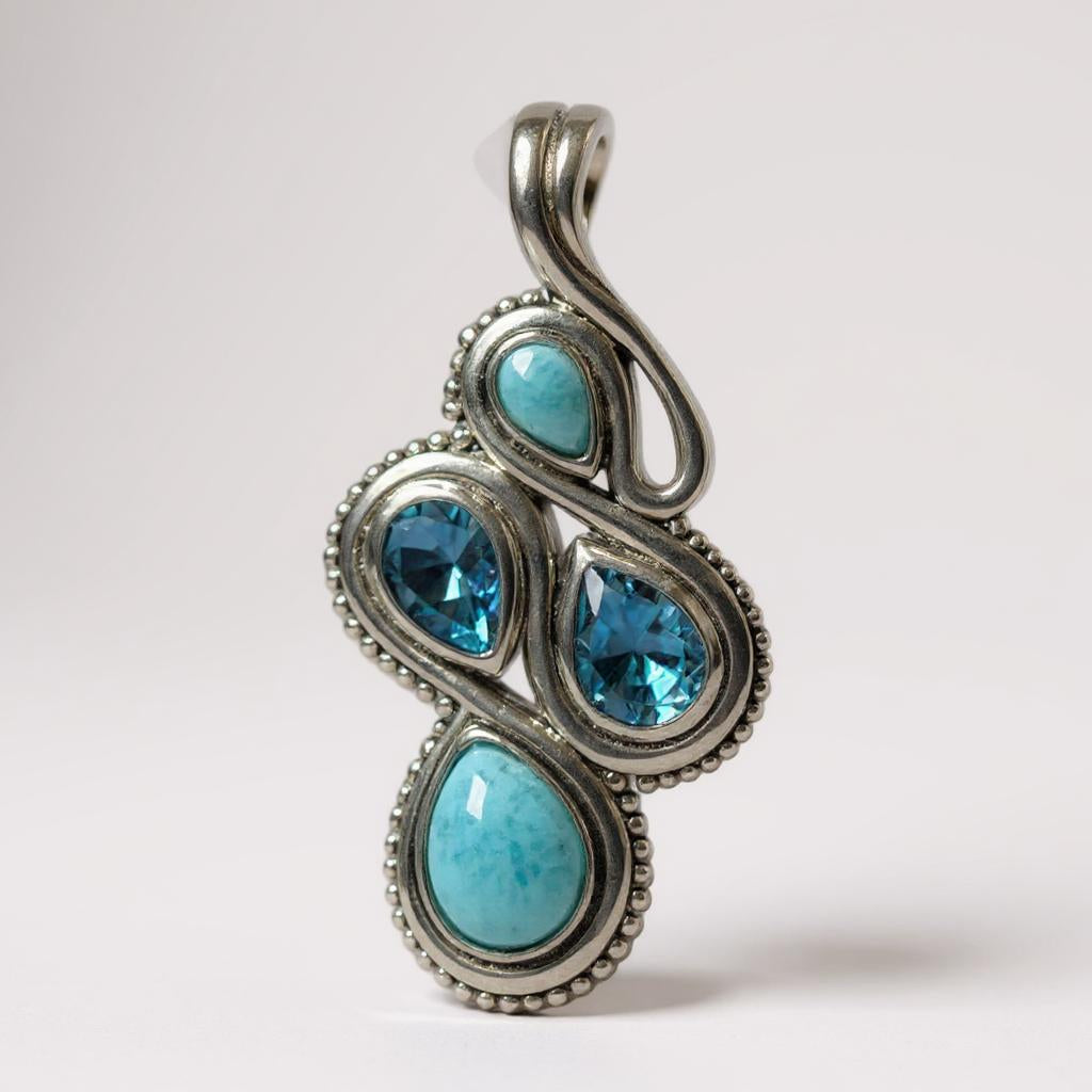 - Figure 8 style oxidized sterling silver slide with pear shape larimar and blue topaz stones.