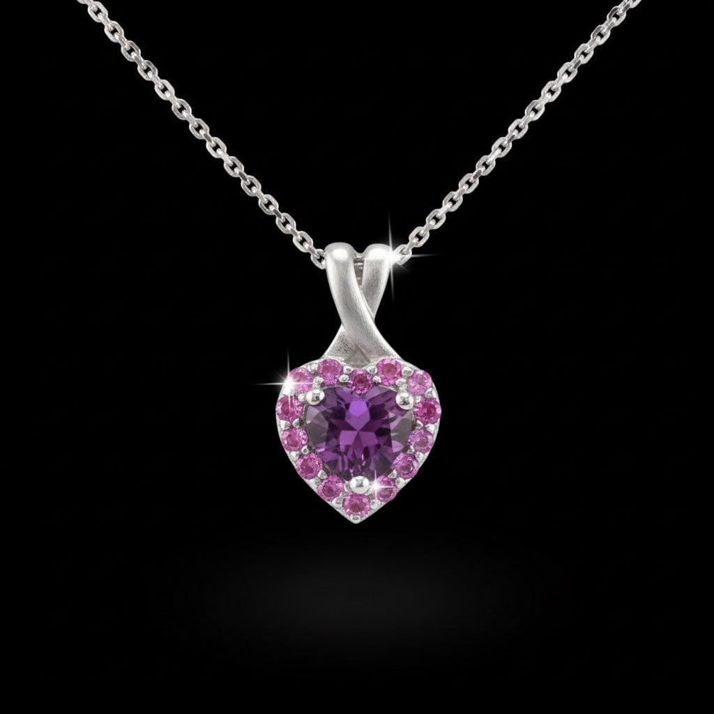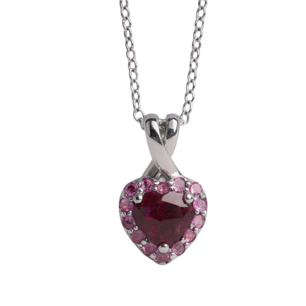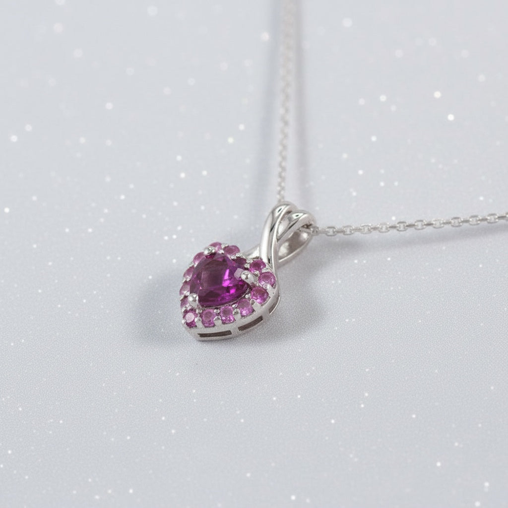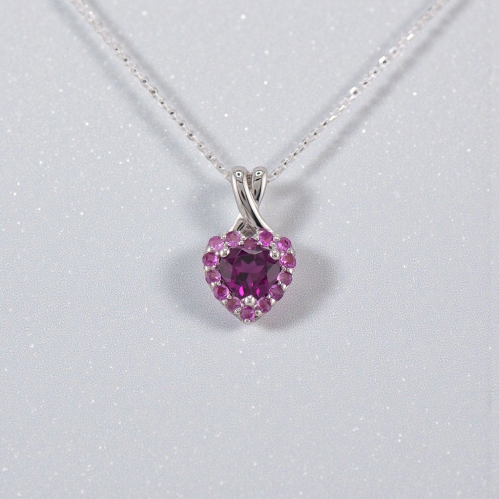 Sterling Silver Rhodolite Garnet Heart and Pink Sapphire Halo Pendant Necklace