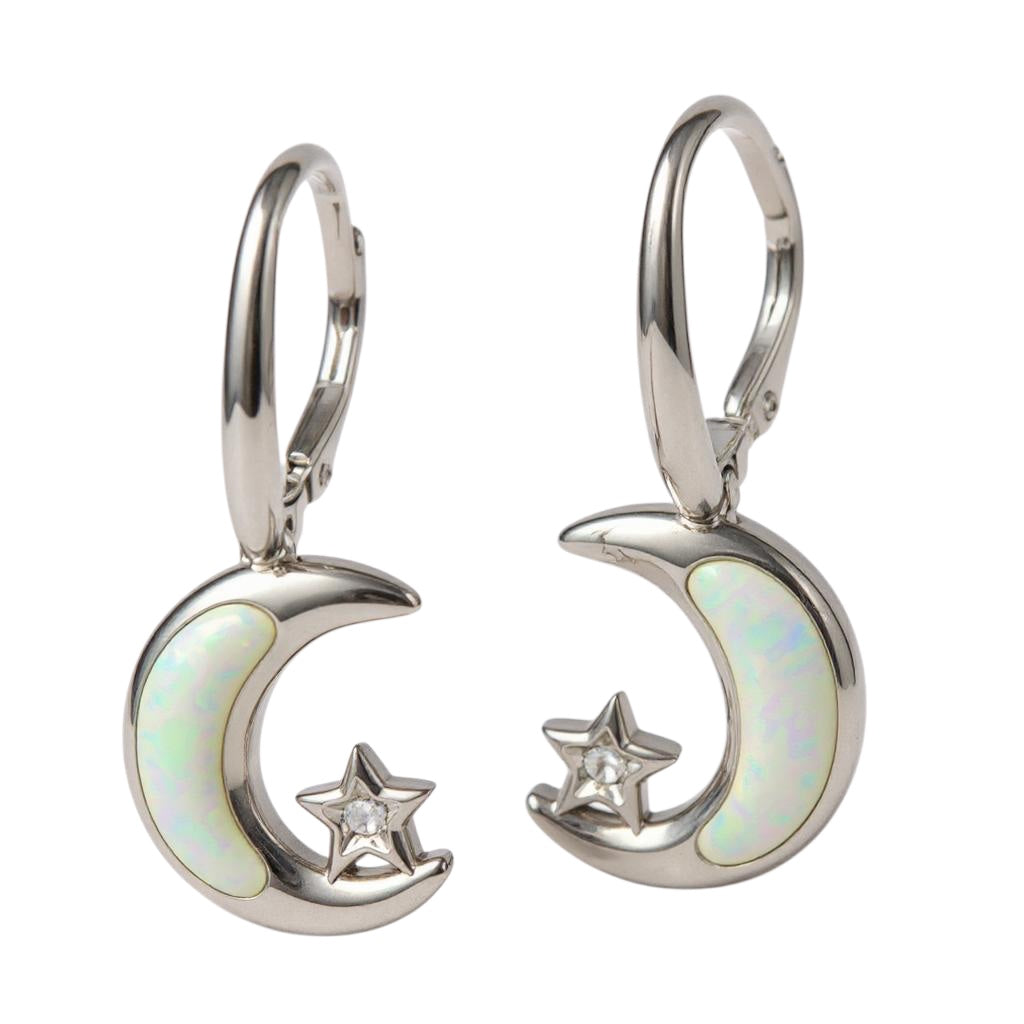 Sterling Silver White Opal Moon & Star Leverback Earrings by Alamea